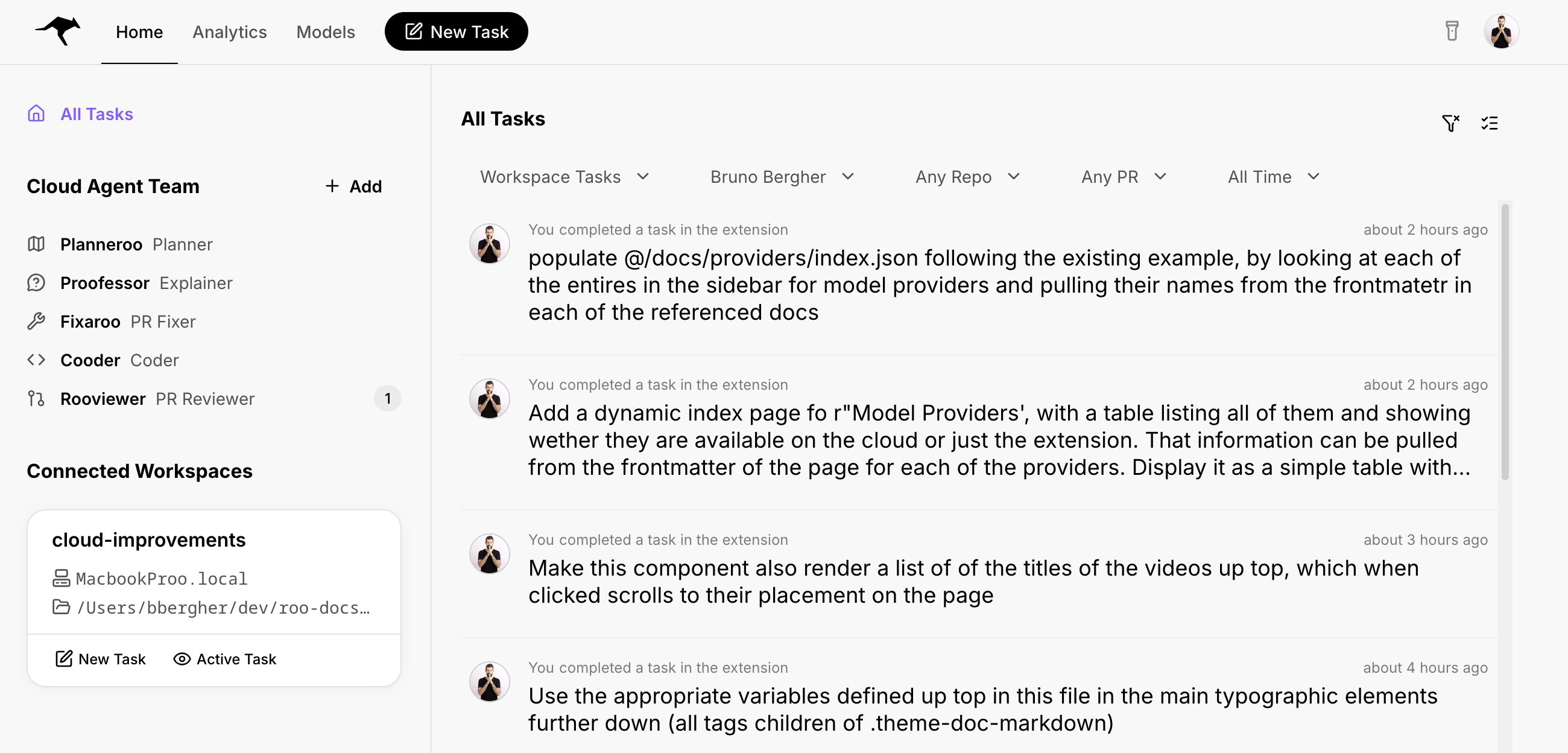 3. Visit the homescreen at https://app.roocode.com to monitor in near real time